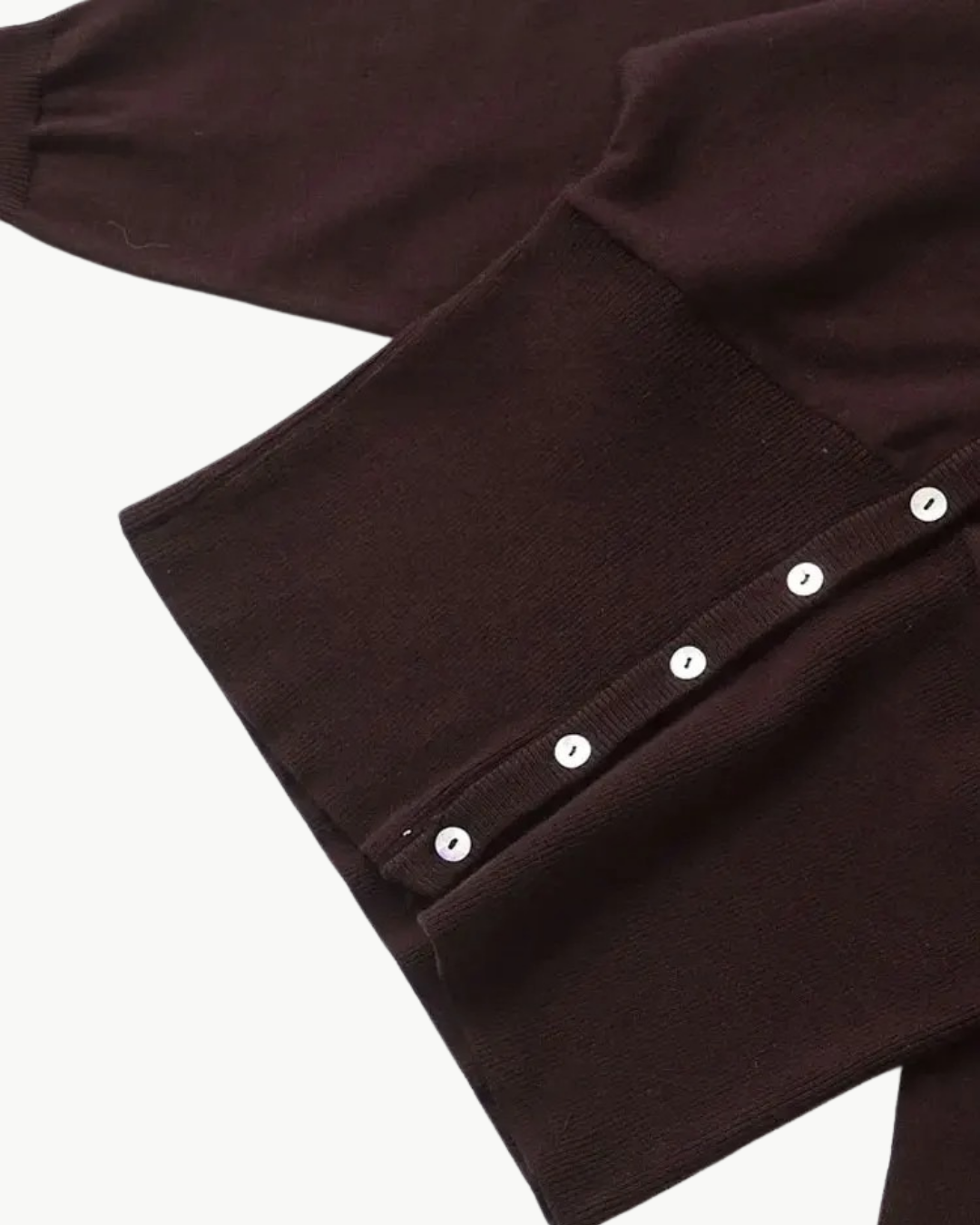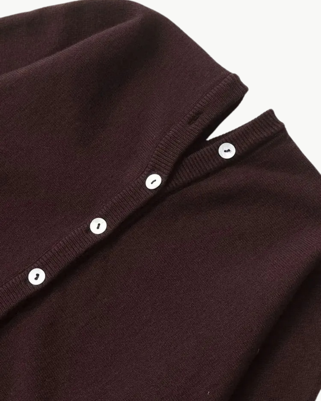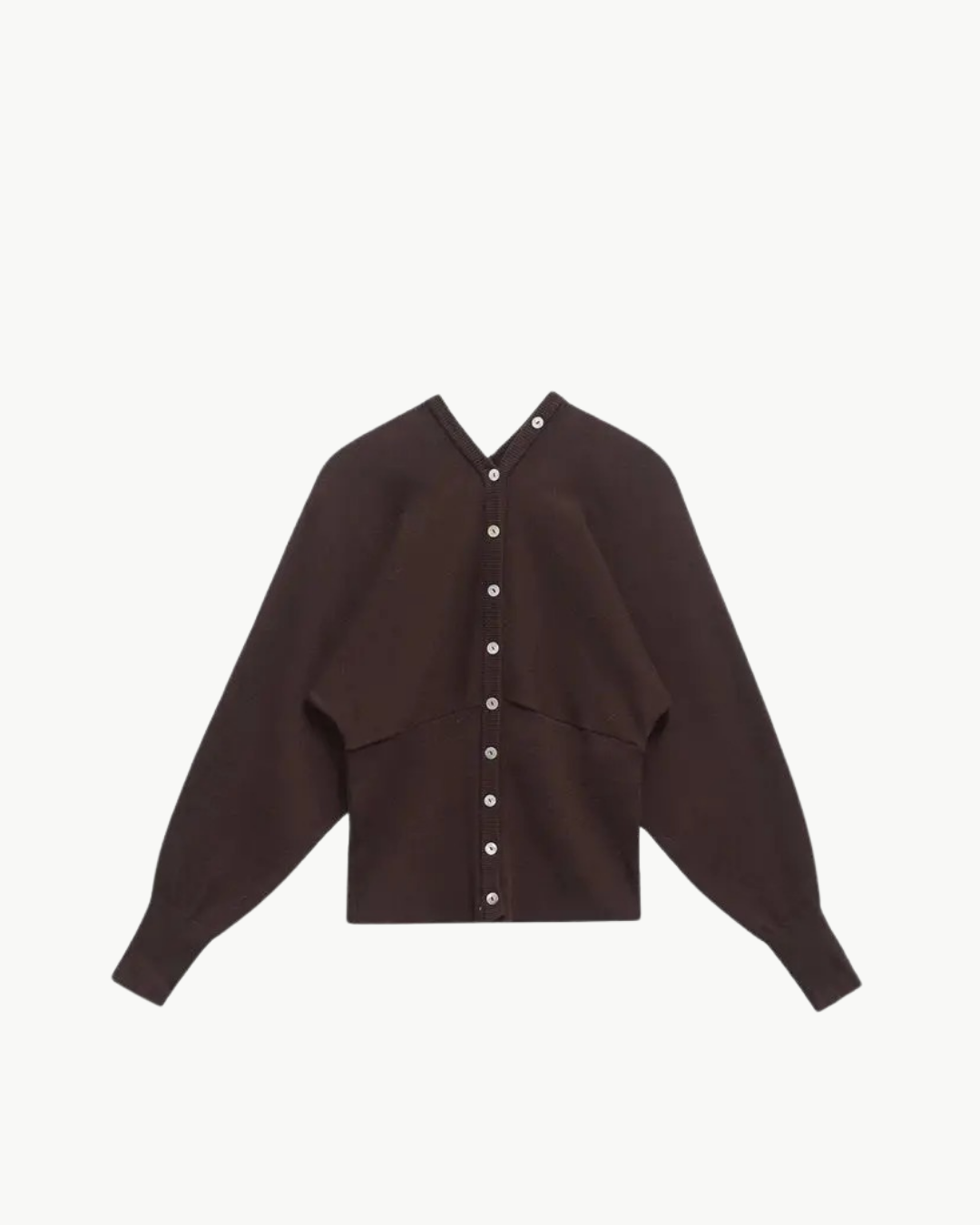 Le Cardigan Cintré à Col V incarne une élégance subtile et précise. Sa coupe ajustée souligne la taille, tandis que les dix boutons nacrés s’alignent avec finesse sur le col en V, apportant équilibre et distinction. En brun profond, il révèle une texture souple et raffinée, typique de la vision Civolé : une sophistication calme, pensée pour le quotidien comme pour la soirée.